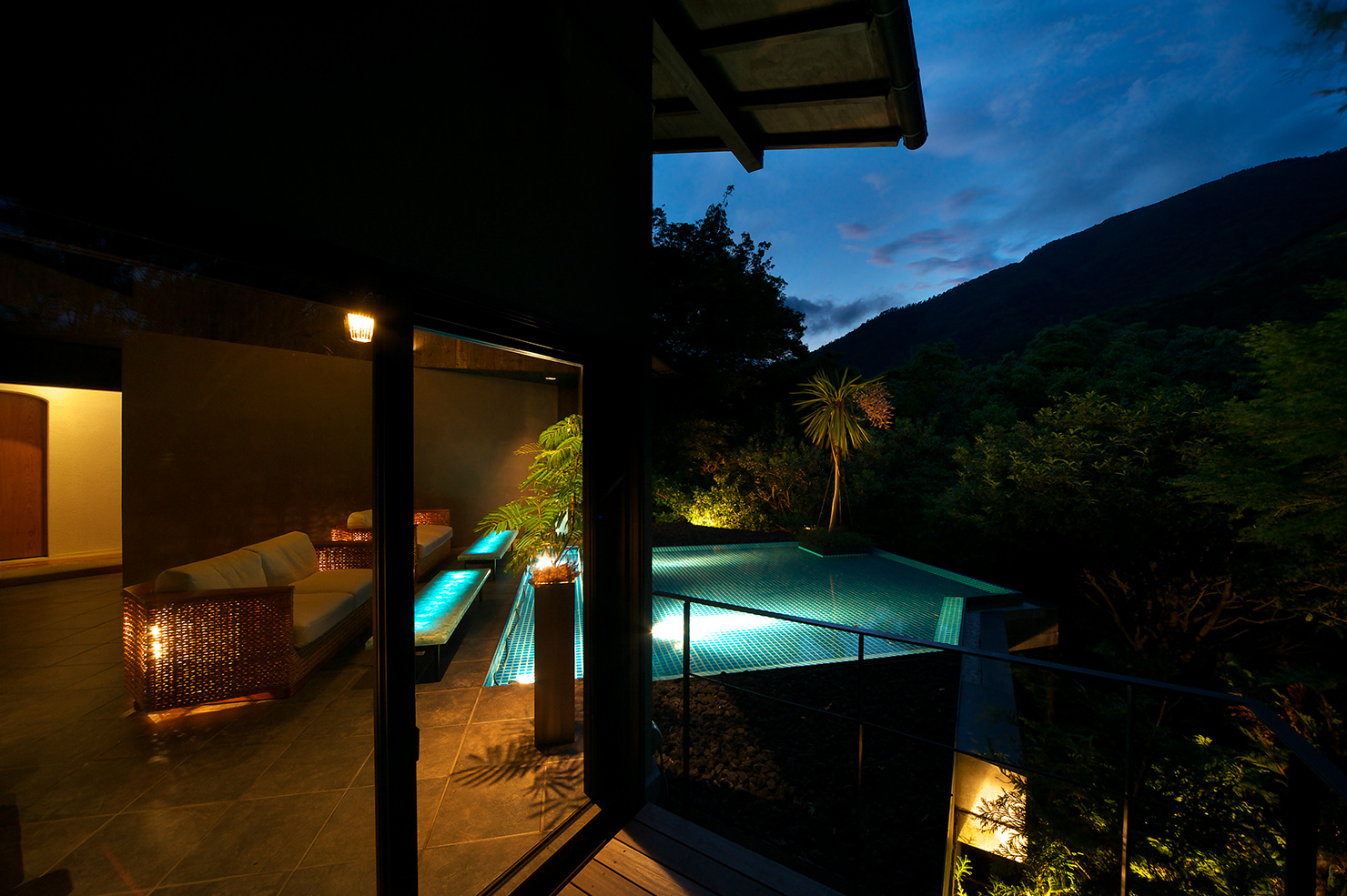 GinyuSpa専用の「源泉かけ流し貸し切り露天風呂」(完全予約制)を併設しています。夜はライトアップされ、幻想的な雰囲気の中、プライベート温泉を満喫して頂けます。